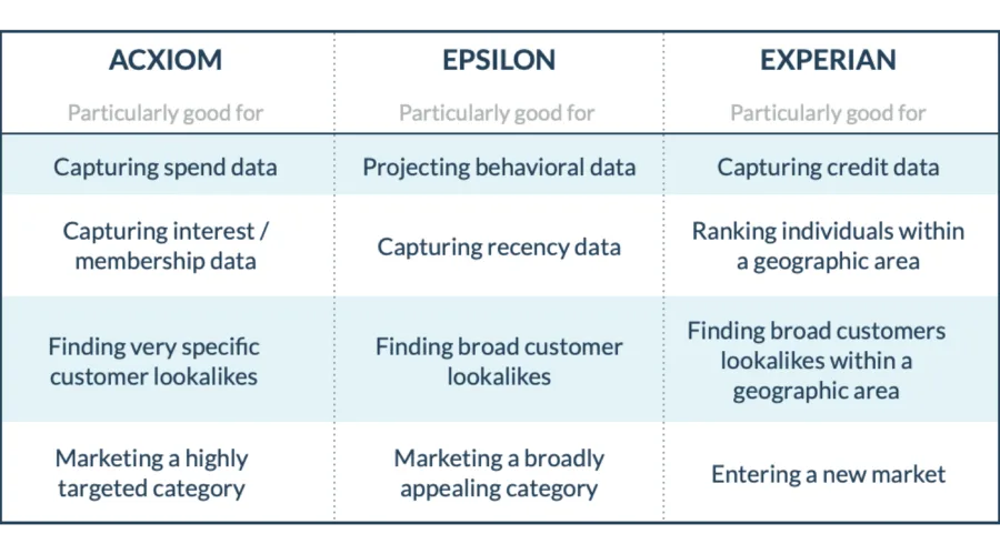 There are several 3rd party data providers in the US, each with its own data set. At Postie, we work with three industry-leading providers: Acxiom, Epsilon, and Experian.