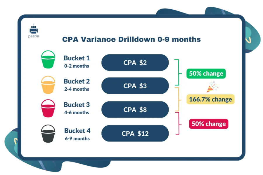 In the above example, the difference in CPA between 0-3 months and 6-9 months is the biggest and is the obvious area for optimization.