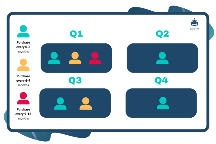 Your higher LTV customers might purchase quarterly (a smaller interval), and on the other end of the spectrum, less frequent buyers may purchase as little as once a year (a greater interval).