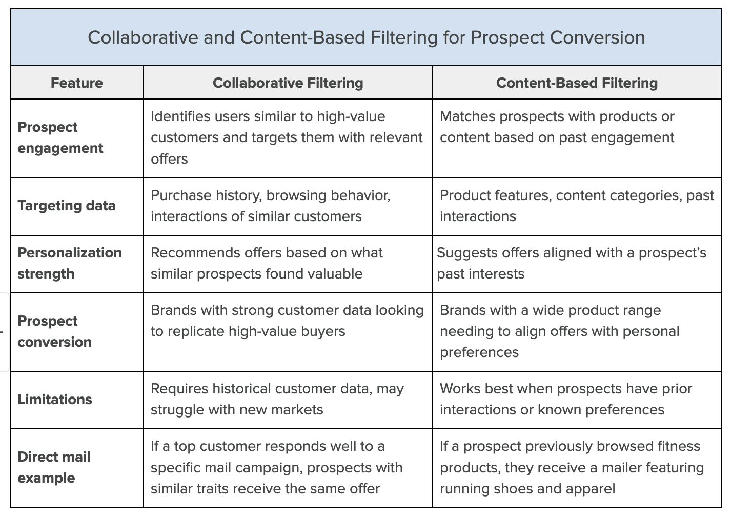 Two key methods—collaborative filtering and content-based filtering—help refine direct mail and omnichannel campaigns for greater precision. While both personalize outreach, they take different approaches to identifying the right prospects and delivering the most relevant offers.