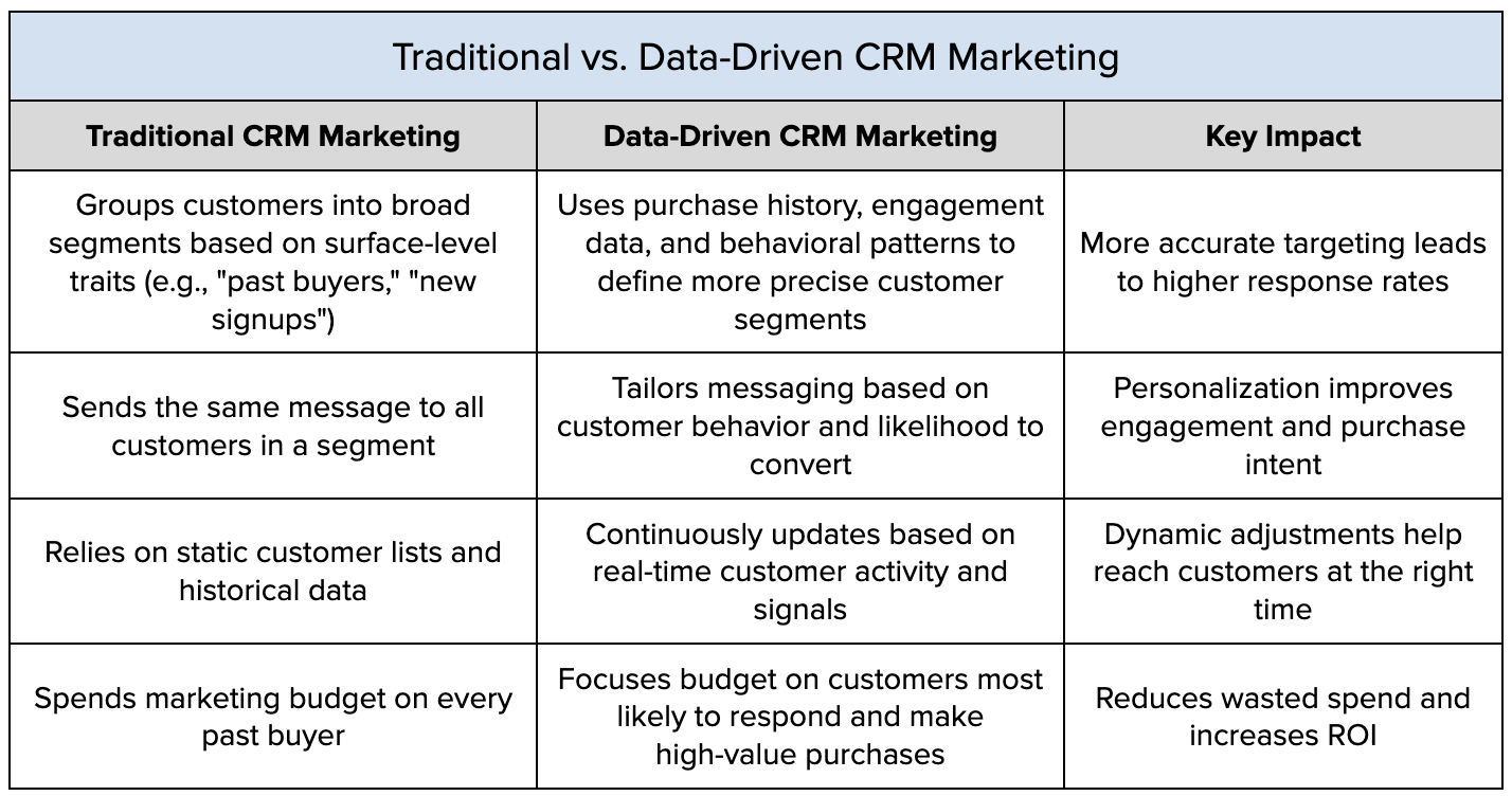 What traditional CRM marketing lacks is precision—the ability to target the right customers at the right time with the right offer. Instead of broad, outdated segmentation, today’s best CRM strategies use data-driven insights to create high-impact, hyper-relevant campaigns that drive stronger results.